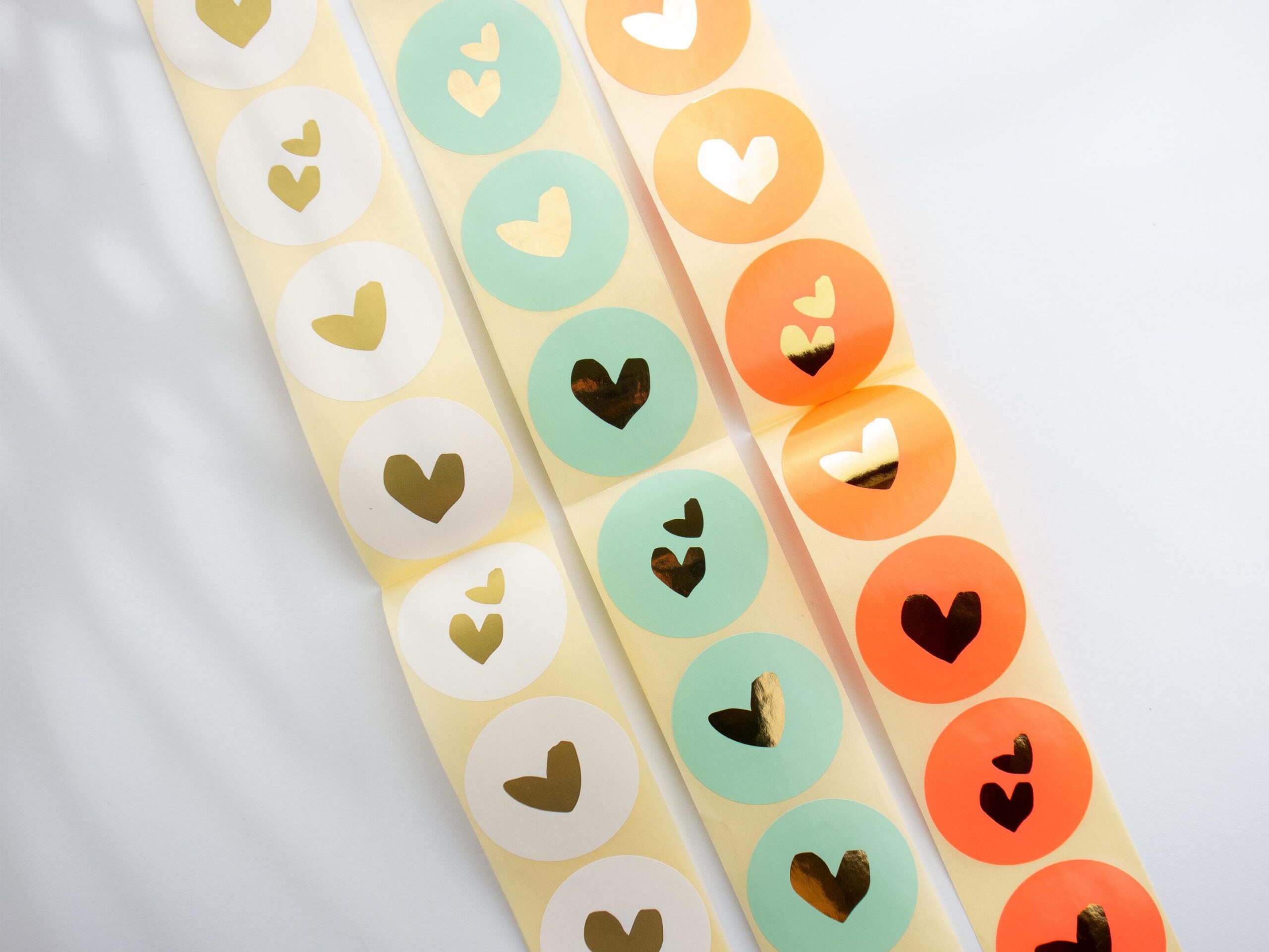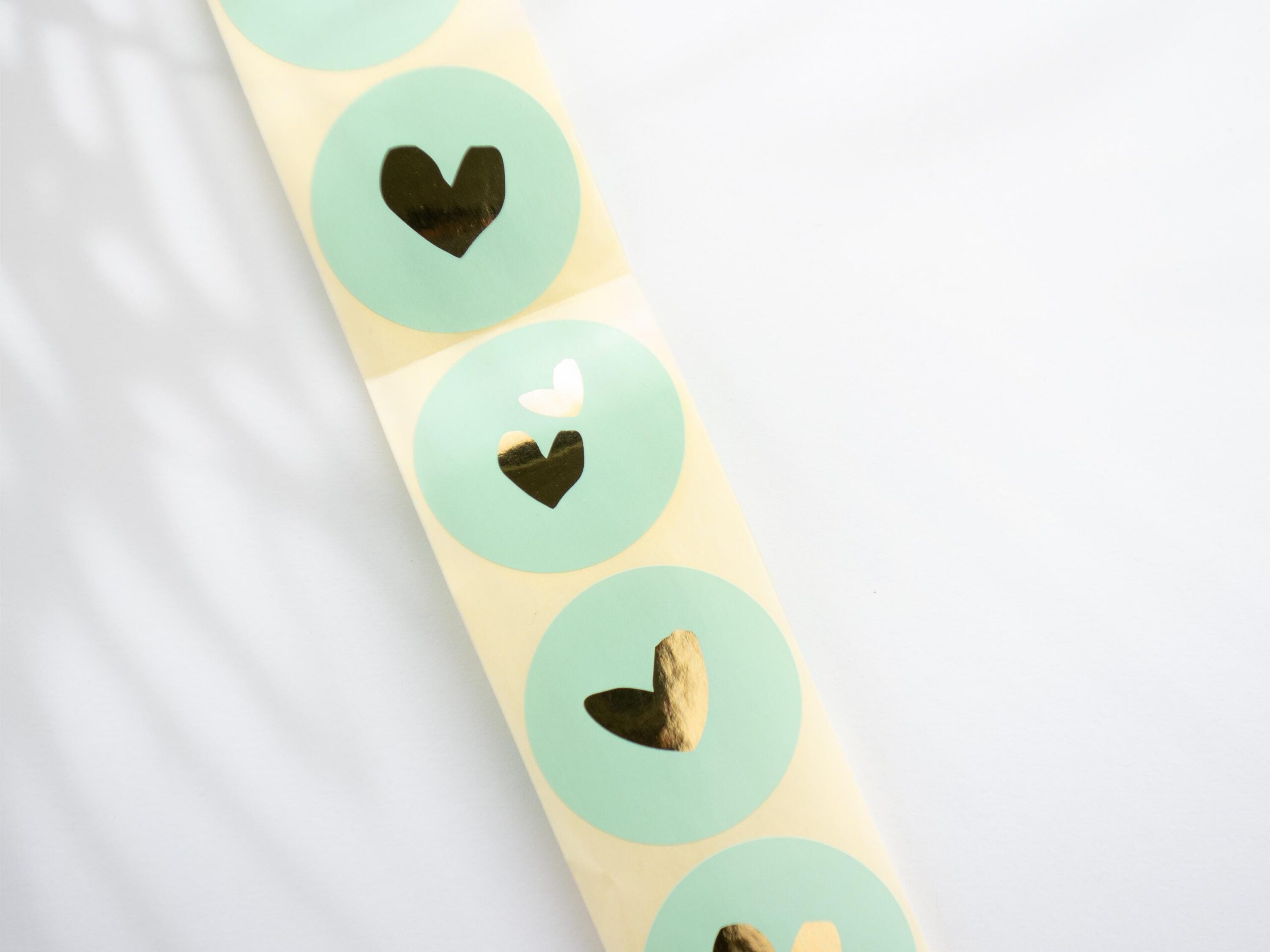 Verleihe jedem Geschenk eine persönliche Note mit unseren runden Stickern (Ø 5 cm) mit goldenen Herzmotiven auf grünem Hintergrund.