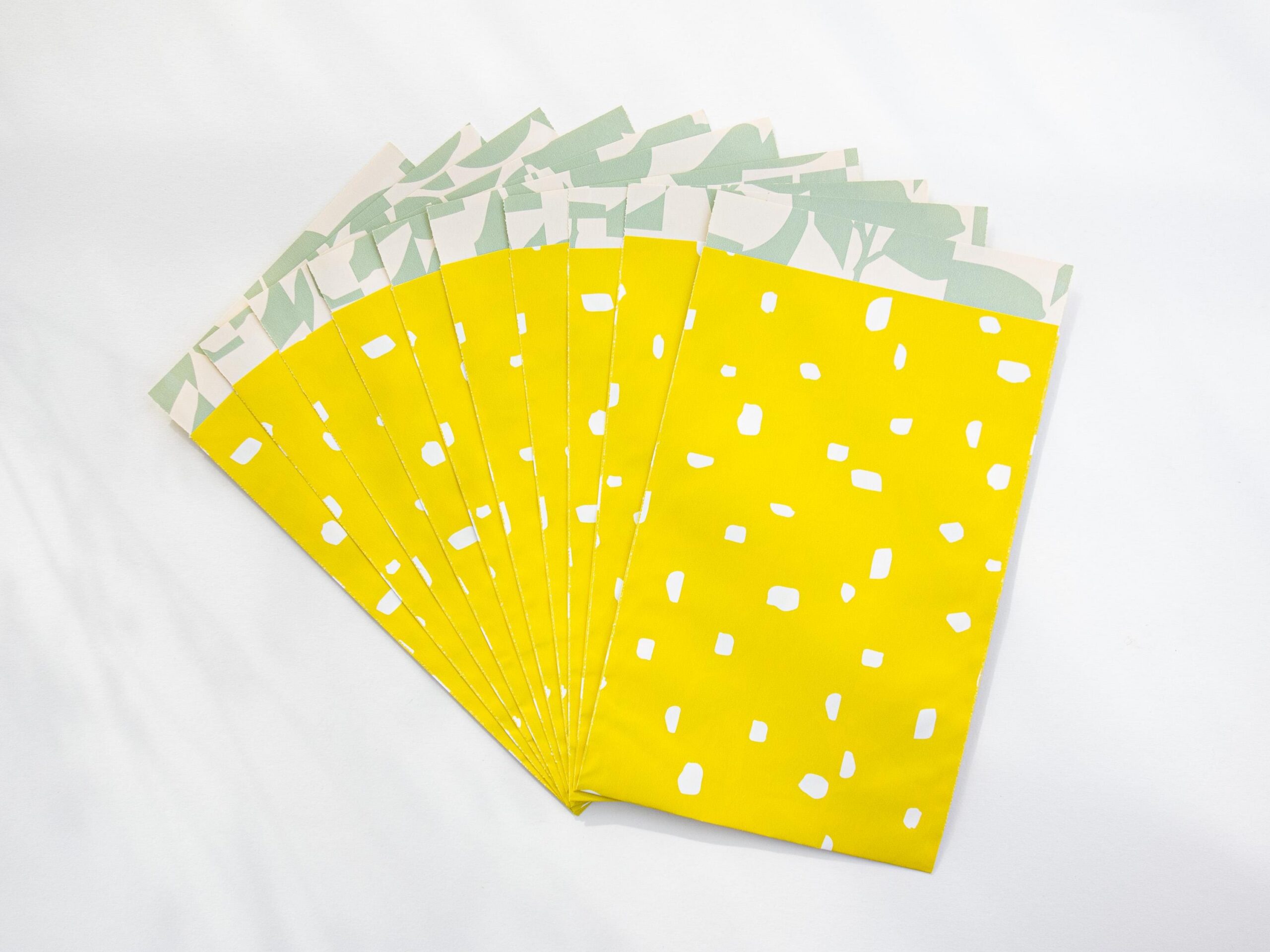 Hochwertige Papiertüten mit weißen Punkten auf gelbem Hintergrund. Die Innenseite ist mit einem abstrakten grünen Muster gestaltet.