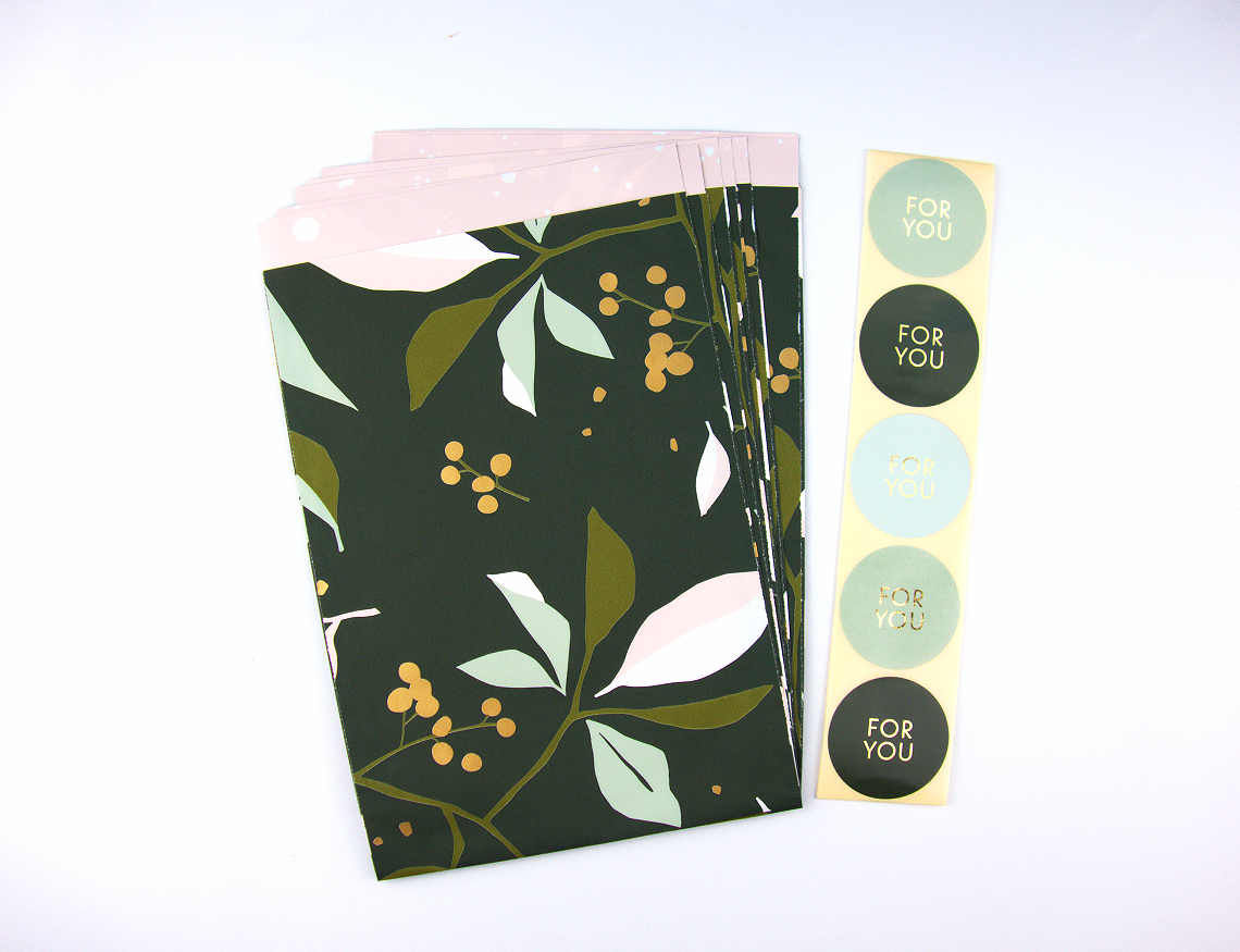 Dieses liebevolle Set besteht aus Papiertüten mit Beeren- und Zweigmuster auf grünem Hintergrund. Die Innenseite der Tüten ist in zartem Rosa gehalten. Passend dazu gibt es runde grüne Sticker mit der Aufschrift „For You“.