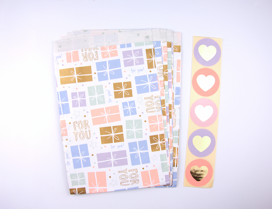 Dieses liebevolle Set besteht aus Papiertüten mit dem Motiv kleiner Geschenkboxen. Dazu gehören passende Aufkleber mit goldenen Herzchen.