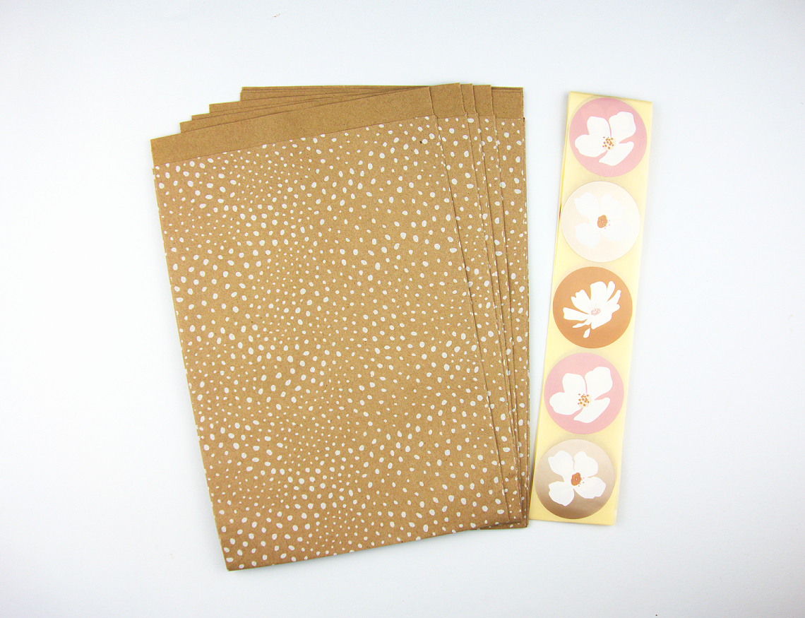 Dieses liebevolle Set besteht aus hochwertigen Papiertüten aus Kraftpapier mit feinen weißen Punkten. Passend dazu gibt es runde Sticker mit floralem Motiv.