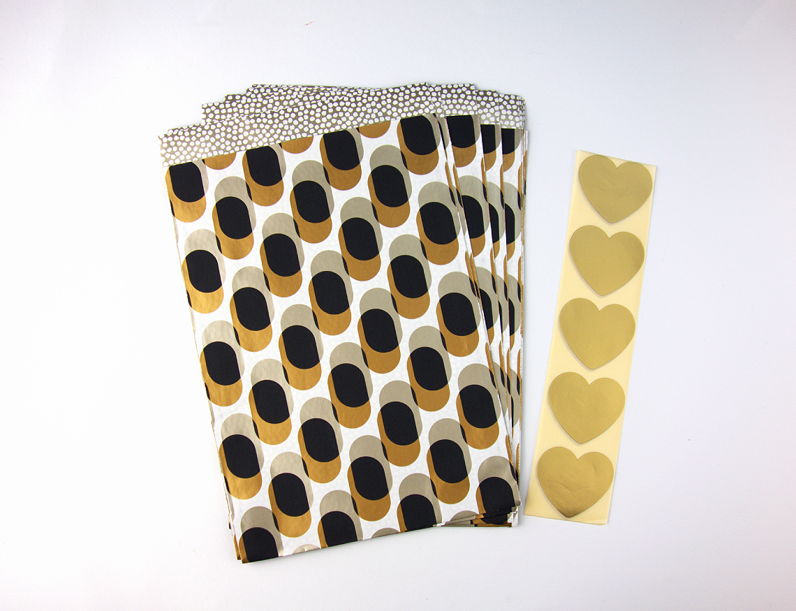 Dieses liebevolle Set besteht aus Papiertüten mit abstrakten schwarz-goldenen Ovalen. Die Innenseite der Tüten ist mit feinen goldfarbenen Punkten verziert. Dazu gibt es passende Aufkleber in Form von goldenen Herzen.