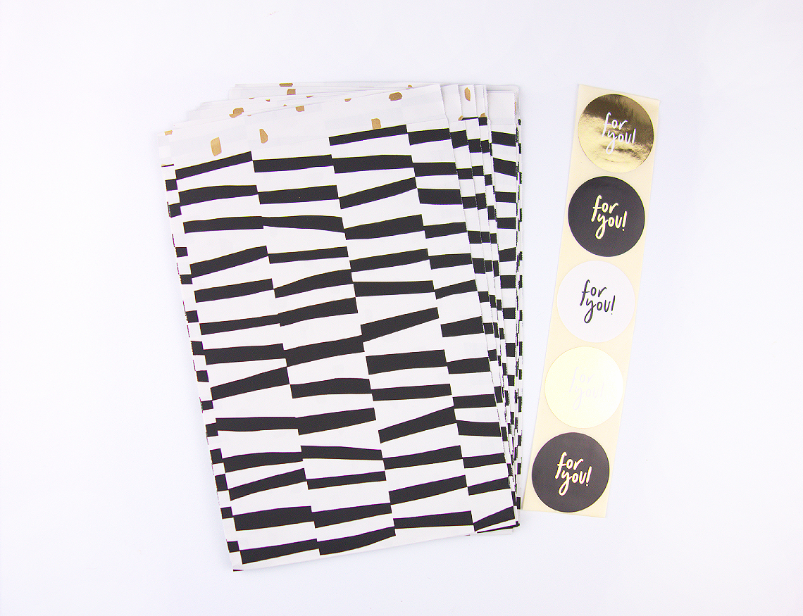 Dieses liebevolle Set besteht aus hochwertigen Papiertüten mit abstrakten Schwarz-Weiß-Streifen. Die Innenseite der Tüten ist mit goldfarbenen Punkten auf weißem Hintergrund verziert. Passend dazu gibt es runde Sticker „For You“ im eleganten Schwarz-Gold-Design.