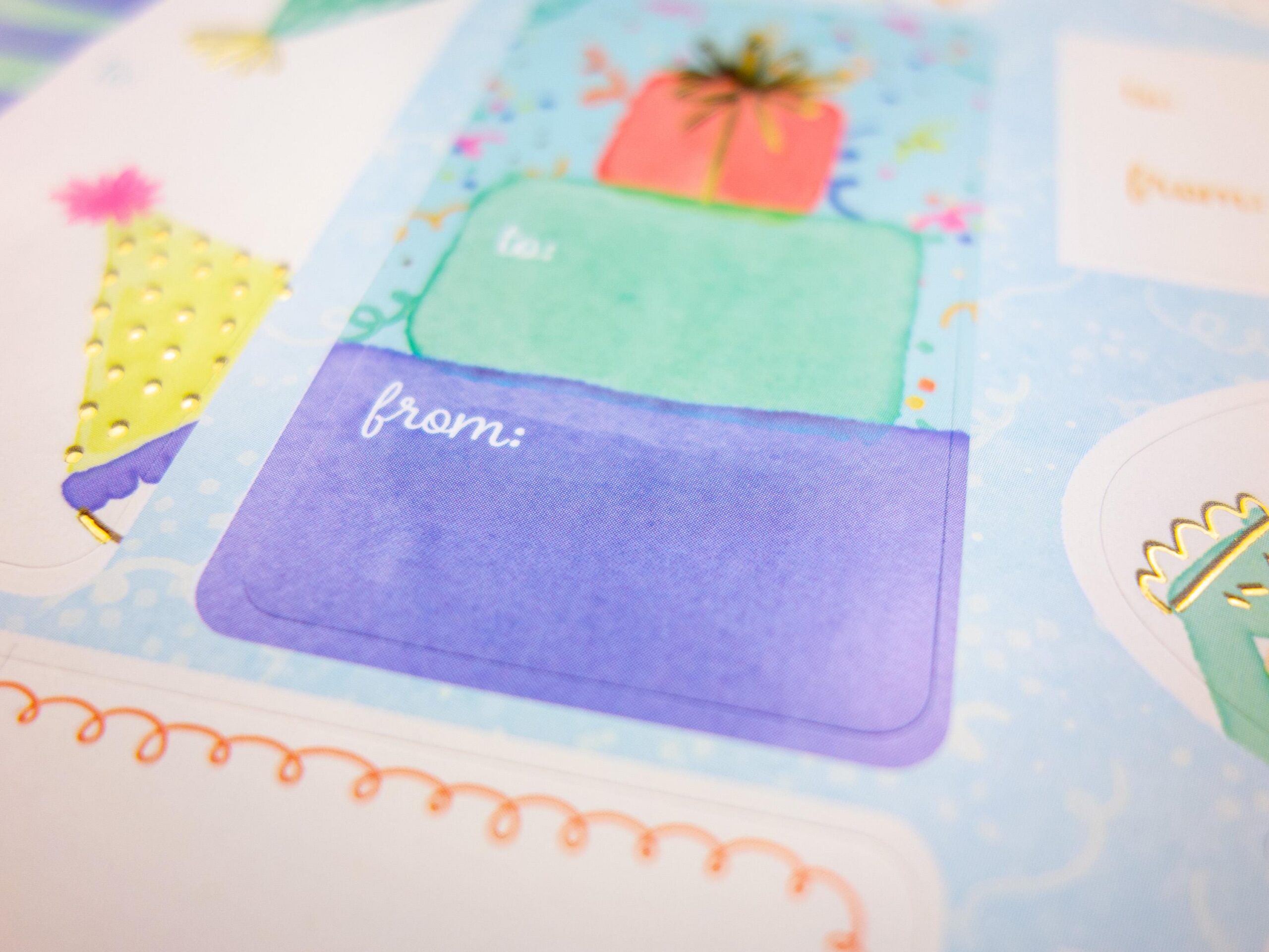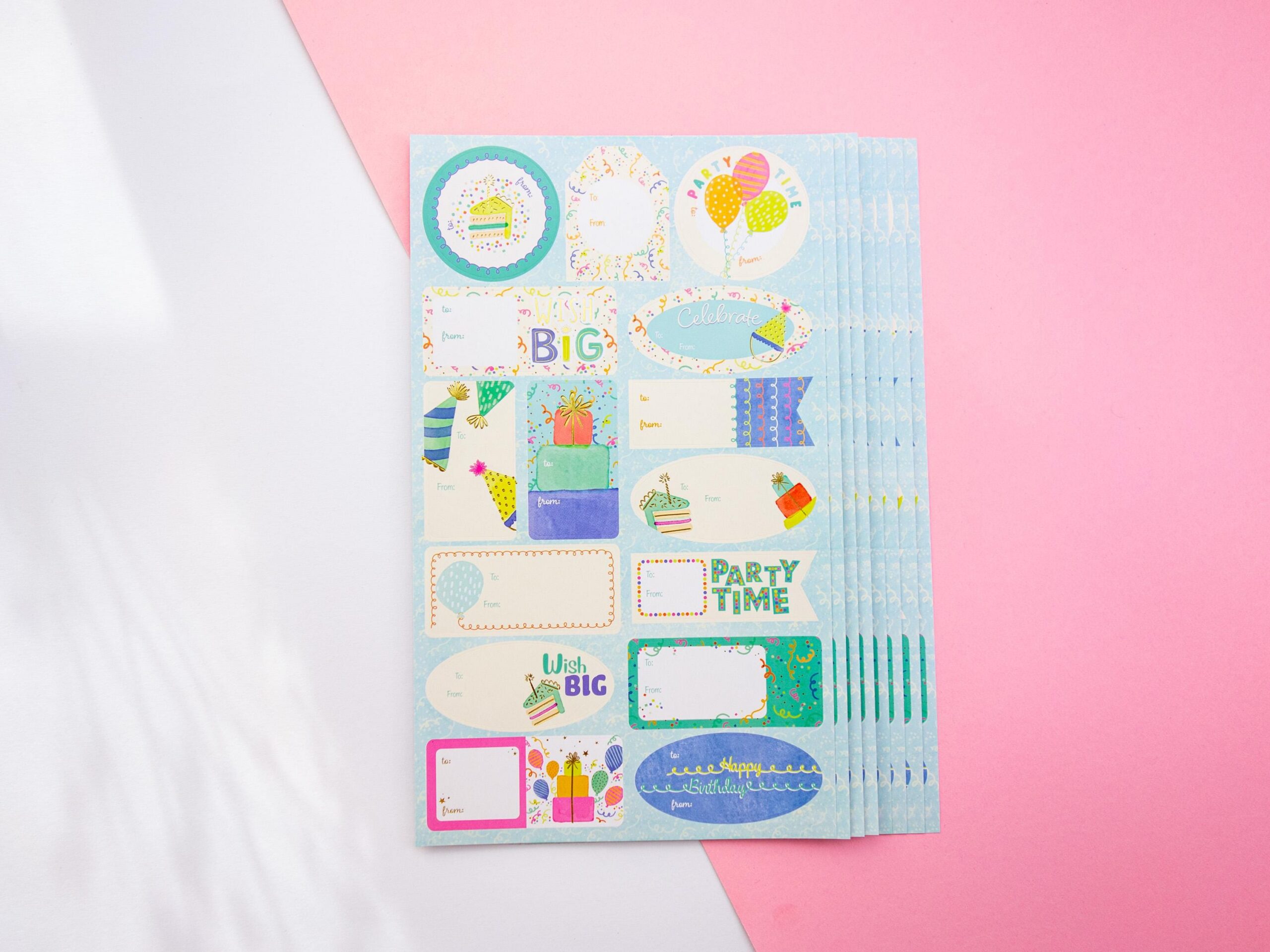 Dieser bunte Stickerbogen enthält 15 Aufkleber mit fröhlichen Party-Motiven: Torten, Geschenke, Kerzen und mehr.